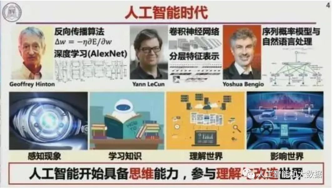 人工智能時代出現(xiàn)了三位深度學習的奠基人,也是2019年的圖靈獎獲得者。第一是Geoffrey Hinton(杰弗里?辛頓),反向傳播算法的代表人物;第二是Yann LeCun(楊立昆),卷積神經(jīng)網(wǎng)絡的代表人物;第三是Yoshua Bengio(約書亞?本吉奧),序列概率模型的代表人物。