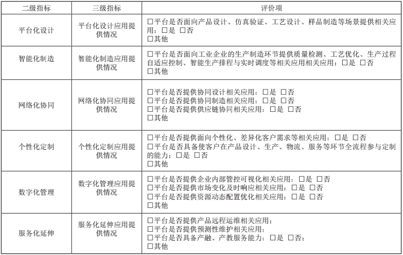 新模式應用能力主要包括平臺化設計、智能化制造、網(wǎng)絡化協(xié)同、個性化定制、服務化延伸、數(shù)字化管理六個方面,用于評價工業(yè)互聯(lián)網(wǎng)平臺賦能制造業(yè)數(shù)字化轉(zhuǎn)型新模式應用的供給能力,具體評價指標和評價項表3。