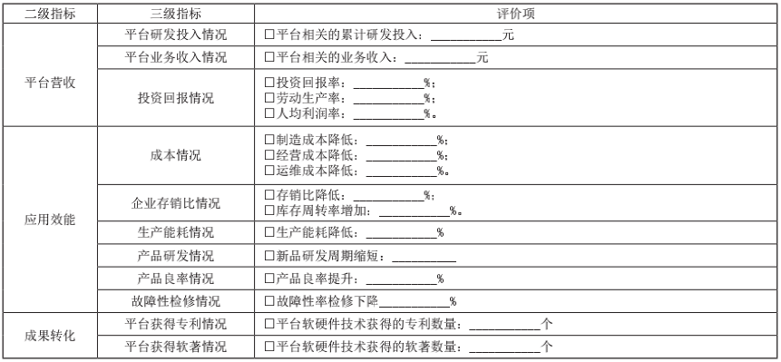 可持續(xù)發(fā)展能力主要包括平臺營收、應用效能兩個方面,用于評價工業(yè)互聯(lián)網(wǎng)平臺賦能制造業(yè)數(shù)字化轉(zhuǎn)型的可持續(xù)發(fā)展能力,具體評價指標和評價項如表5所示。