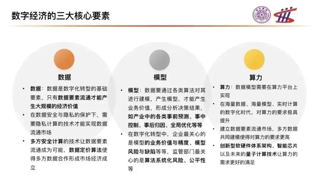 數(shù)字經(jīng)濟(jì)的三大核心要素包含數(shù)據(jù)、模型算法、算力三個(gè)方面,每一個(gè)方面都有相應(yīng)的前沿核心技術(shù),我們可以進(jìn)行一一討論。