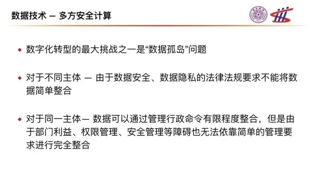 數(shù)字化轉(zhuǎn)型的最大挑戰(zhàn)之一是“數(shù)據(jù)孤島”問題:對(duì)于不同主體,由于數(shù)據(jù)安全、數(shù)據(jù)隱私的法律法規(guī)要求不能將數(shù)據(jù)簡(jiǎn)單整合;對(duì)于同一主體,數(shù)據(jù)可以通過管理行政命令有限程度整合,但是由于部門利益、權(quán)限管理、安全管理等障礙也無(wú)法依靠簡(jiǎn)單的管理要求進(jìn)行完全整合。