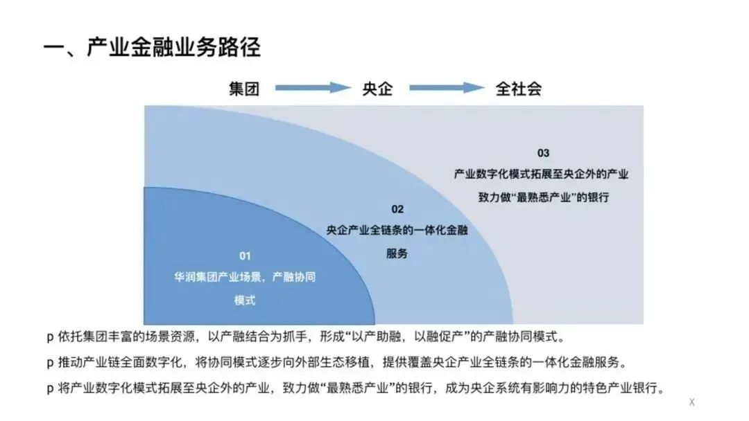 從路徑上講,華潤(rùn)集團(tuán)有豐富的場(chǎng)景資源,可以用產(chǎn)融結(jié)合為抓手,形成“以產(chǎn)助融,以融促產(chǎn)”的產(chǎn)融協(xié)同模式。并推動(dòng)產(chǎn)業(yè)鏈全面數(shù)字化,將協(xié)同模式逐步向外部生態(tài)移植。