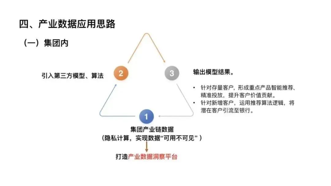 2. 利用隱私計(jì)算技術(shù),“數(shù)據(jù)可用不可見”,在多企業(yè)集團(tuán)內(nèi)部先行形成數(shù)據(jù)流動(dòng)平臺(tái);