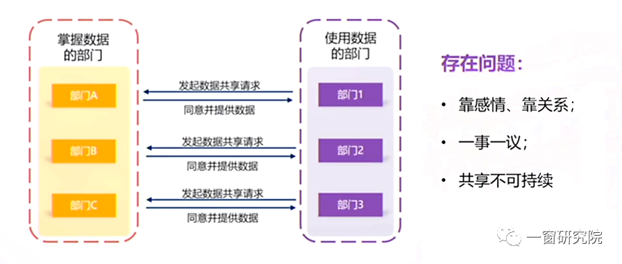 還有就是靠感情、靠關(guān)系的方式,比如兩個(gè)部門的領(lǐng)導(dǎo)是黨校同學(xué),有時(shí)候要用數(shù)據(jù)就可以直接拿到了。但這種靠感情看關(guān)系的實(shí)現(xiàn)機(jī)制很不穩(wěn)定,如果出現(xiàn)領(lǐng)導(dǎo)變更了,可能就拿不到數(shù)據(jù)了,這就會(huì)影響數(shù)據(jù)共享的可持續(xù)性。