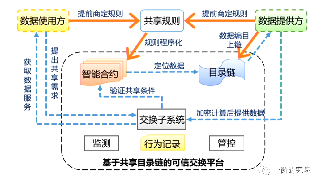 上圖,可以看到這個機(jī)制里面區(qū)分了數(shù)據(jù)使用方、數(shù)據(jù)提供方和共享管理方。在其中非常巧妙的加入了一個「目錄鏈」,這就把政府的職能和數(shù)據(jù)掛起鉤來。