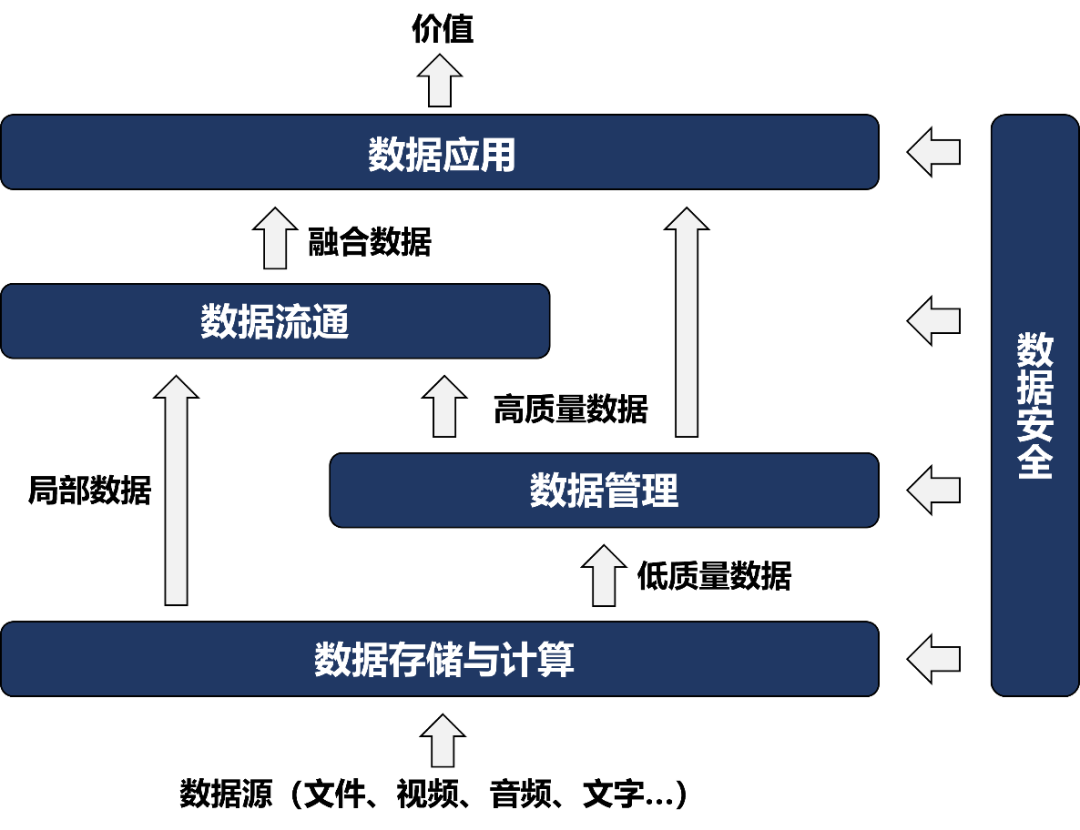 經(jīng)過多年技術(shù)和產(chǎn)業(yè)的發(fā)展,大數(shù)據(jù)領(lǐng)域內(nèi)部逐漸細化,形成數(shù)據(jù)存儲與計算、數(shù)據(jù)管理、數(shù)據(jù)流通、數(shù)據(jù)應用、數(shù)據(jù)安全五大核心領(lǐng)域。如圖1所示,數(shù)據(jù)源通過數(shù)據(jù)存儲與計算實現(xiàn)壓縮存儲和初步加工,通過數(shù)據(jù)管理提升質(zhì)量,通過數(shù)據(jù)流通配置給其它相關(guān)主體,通過數(shù)據(jù)應用直接釋放價值,并由數(shù)據(jù)安全技術(shù)進行全過程的安全保障。